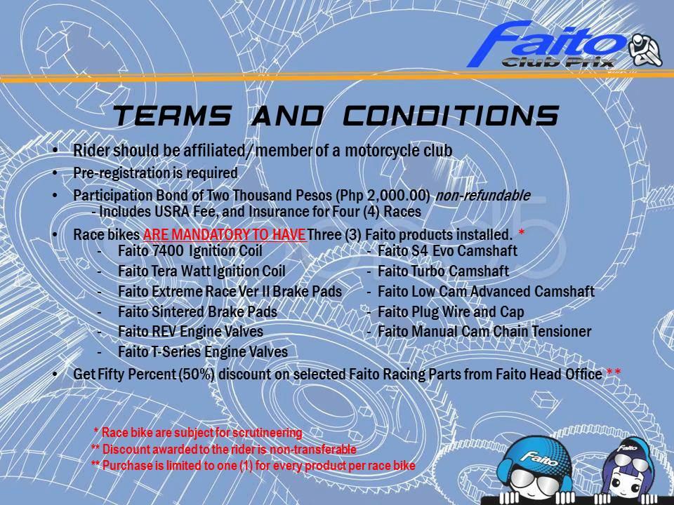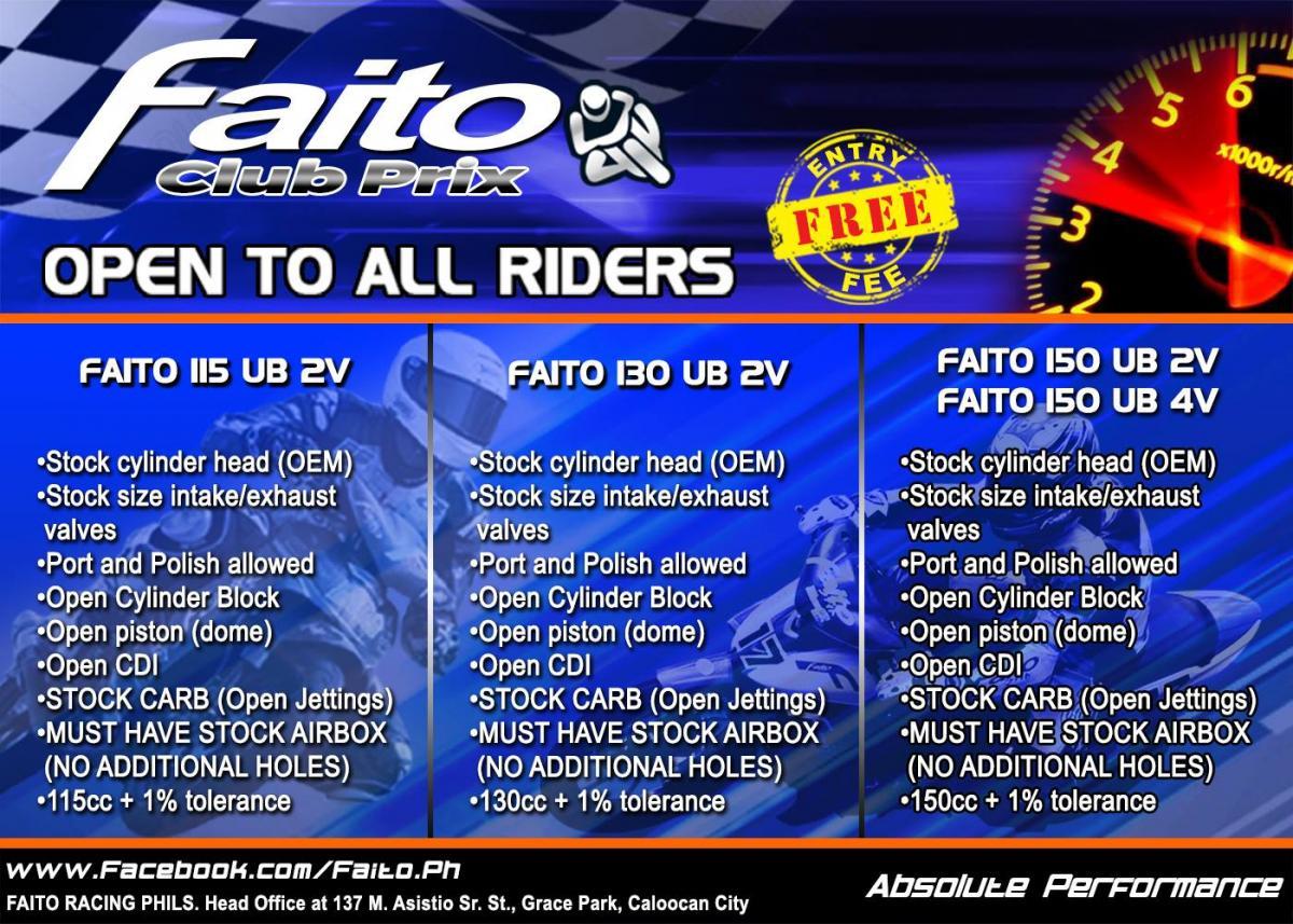 FAITO CLUB PRIX Terms and Conditions FAITO CLUB PRIX Riders Registration Form FAITO CLUB PRIX Waiver Form FAITO CLUB PRIX ENGINE RULES FAITO CLUB PRIX Mandatory Parts FAITO AUTHORIZE DEALERS