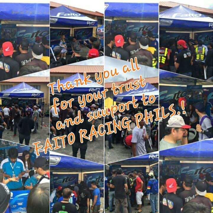 It was a bit of a gloomy morning of 15 November 2015, Sunday at the Carmona Race Track. As early as 6 a.m. different bike groups and spectators flocked to the Carmona Race Track, Carmona Cavite to witness the most awaited and exciting motorcycle race event of the year which is the Inside Racing GP 9. Faito was blessed to be part of this much awaited event. Once again, Faito Racing products were showcased at the Faito booth were everyone is welcomed by the Faito Marketing Team. A lot of inquiries about the product and prices were raised by visitors of the booth. For those who came and wanted to purchase some of the Faito products were given a chance to get of upto 20% discount through the Dice It Up promo, wherein he/she would choose an item to buy and will be asked to shake 4 dices. Each dice has two 5% off printed and should all 4 dice shows four 5% off the winner will get the full 20% off the price of the item purchased. Booth onlookers also enjoyed their visit to the booth, aside from knowing what the Faito product is all about, they also participated on the fun and challenging Faito challenge. Once a participant finished the challenge, he/she will win a cool Faito shirt. It was a fun filled day of games and exciting races which was witnessed by hundreds of spectators coming from different bike clubs, motorcycle race enthusiast and the general public. Suddent change of weather occurred and there was rainfall in the afternoon, spectators patiently waited and watched the race despite of the rain.