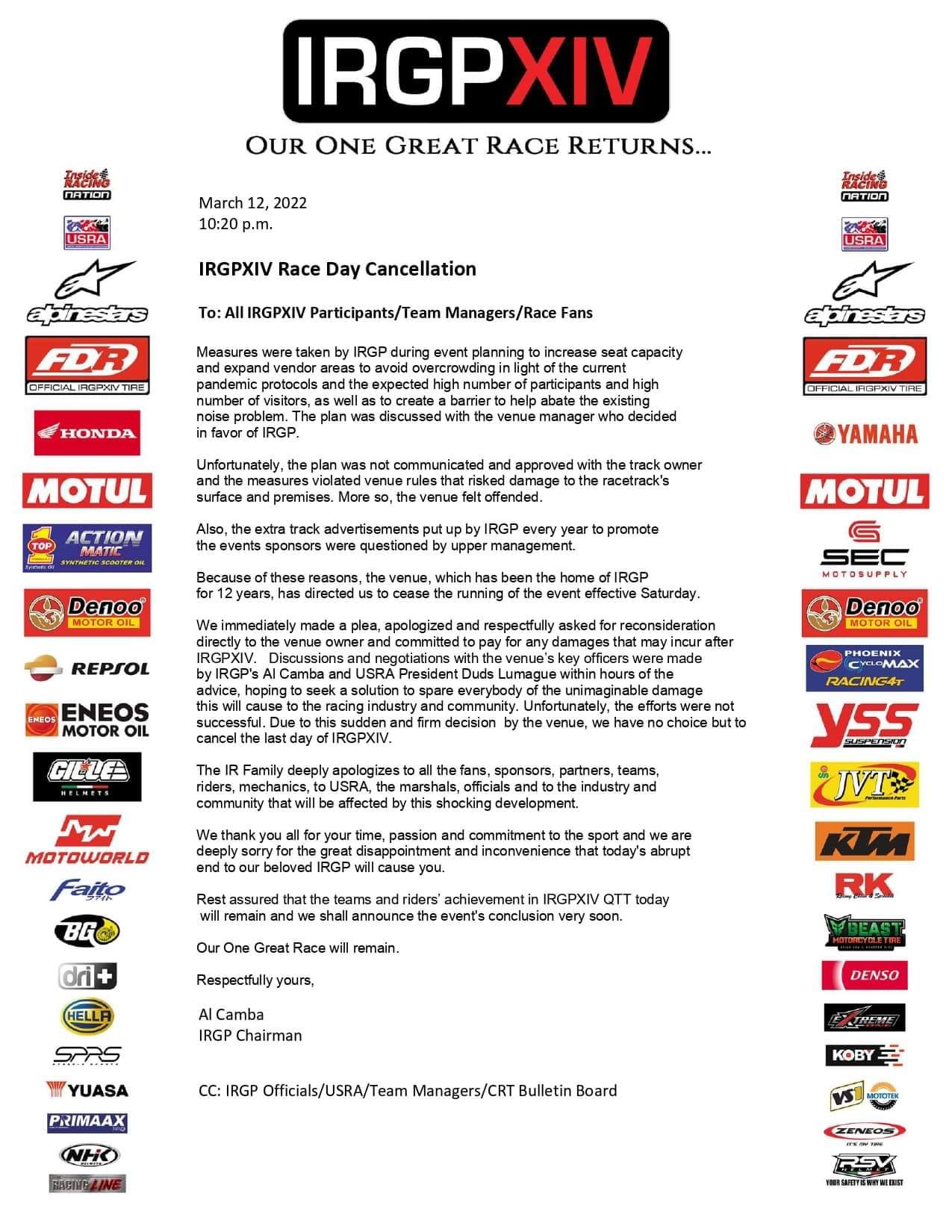 But unfortunately Inside Racing realease a statement on March 12, 2022 (Saturday) 10:20pm that the race day will be cancel due to some reaseon, every one was shocked and doleful on the announcement, on the next day morning (March 13,2022) Inside Racing set up a meeting on all the race teams and sponsors regarding the announcement.